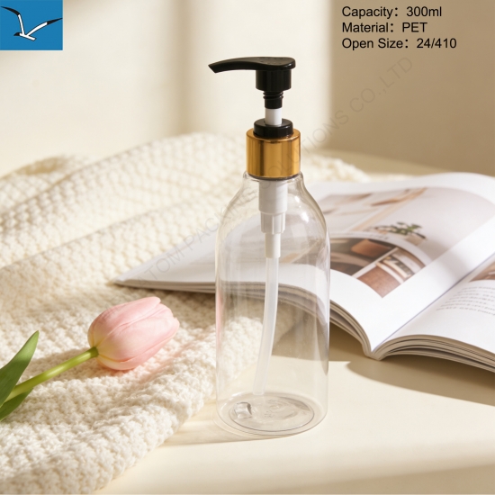 10oz 300ml PET Cylinder Shape Bottle Gold Black Lotion Pump Screen Printing Surface UV/Heat Transfer Shampoo Skin Clear Bottles