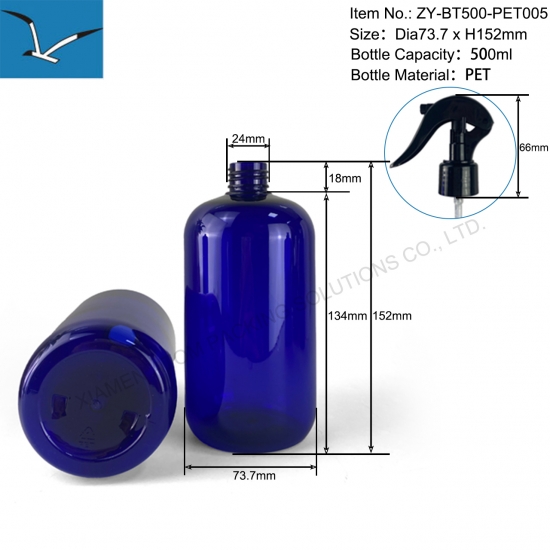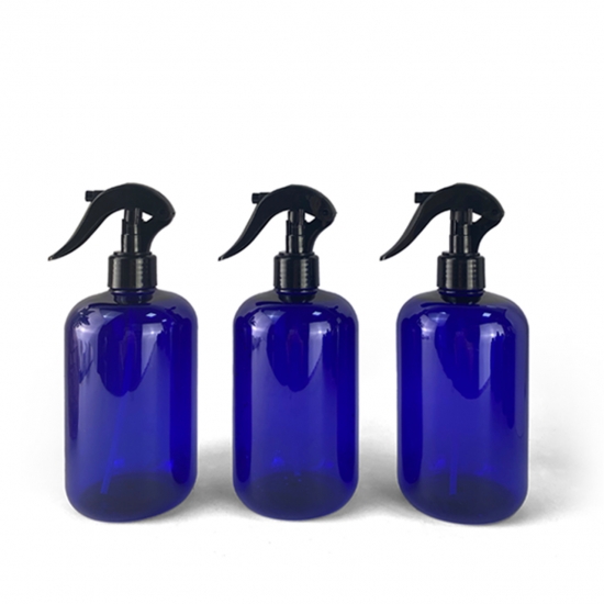 16oz Cobalt Blue Boston Shape PET Empty Bottle 500ml Trigger Sprayer for Shampoo Lotion Hair Packaging Cosmetic Container