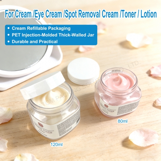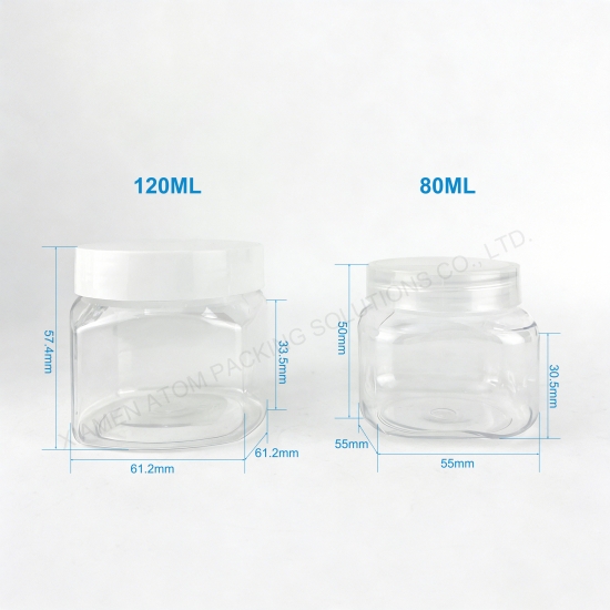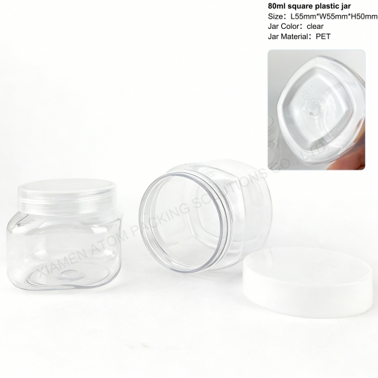 - 1.80g 120g Square Clear PET Jar adopts wide mouth design for easy filling and use, ideal for face cream, skin care and cosmetic packaging.2.Made of safe PET material, it is non-toxic, odorless, durable, refillable and leak-proof, ensuring product safety and long service life.3.High transparency shows the inner product clearly, square shape saves space and enhances display and transportation efficiency.4.We support wholesale and small MOQ orders with stable quality, fast delivery and competitive factory price.5.Widely used in cosmetic packaging, skin care containers, travel refilling and home storage with strong practicability.