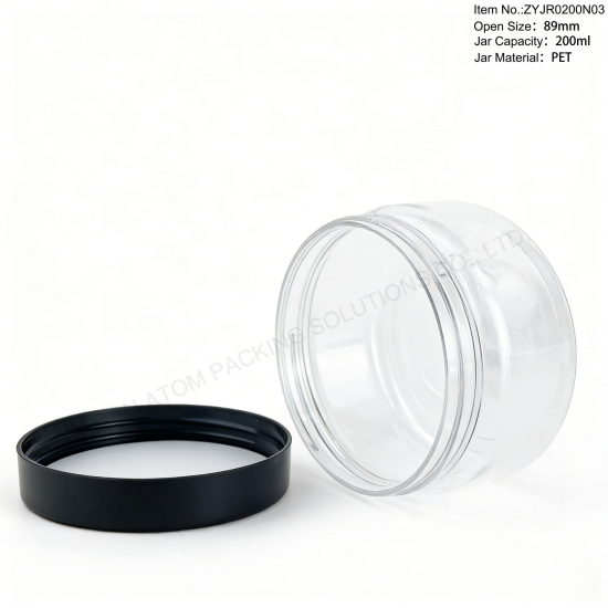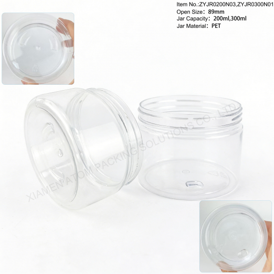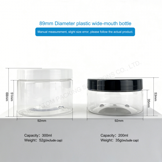- 1.Perfect 200ml & 300ml capacities, ideal for daily food & cosmetic storage, widely used for cookies, candies, nuts, honey, spices, powder, flower tea, cream, cosmetics and small items.2.100% food-grade PET material, BPA free, non-toxic, odorless, safe for direct food contact, meeting international packaging standards.3.Classic straight-sided wide mouth design with 89mm rib neck, easy to fill, take out and clean, very user-friendly.4.High clear transparency, excellent visibility to showcase products clearly and enhance display effects.