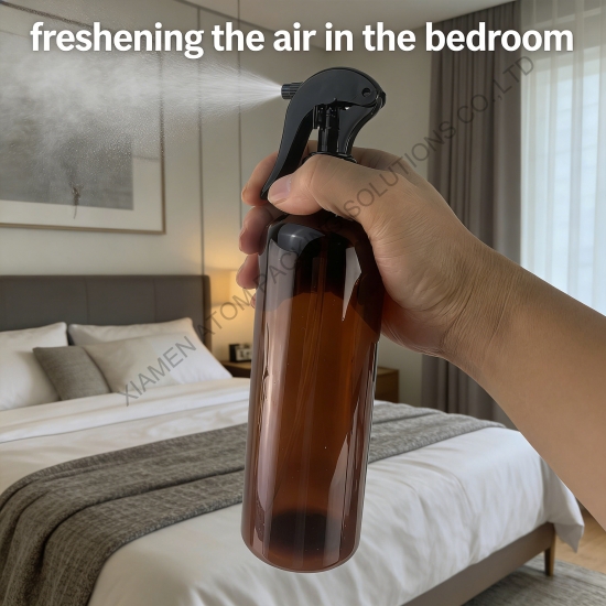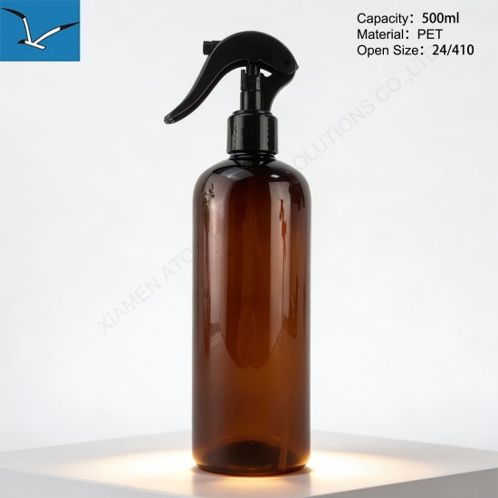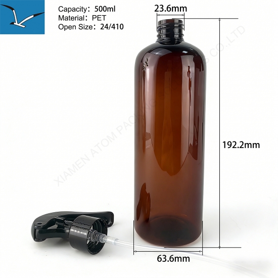 - 1.Custom Color Options & Premium PET Material Available in custom colors including transparent and amber, our 500ml spray bottle is made from food-grade BPA-free PET plastic, offering excellent durability and chemical resistance. The amber variant effectively blocks UV rays to protect light-sensitive liquids from degradation.