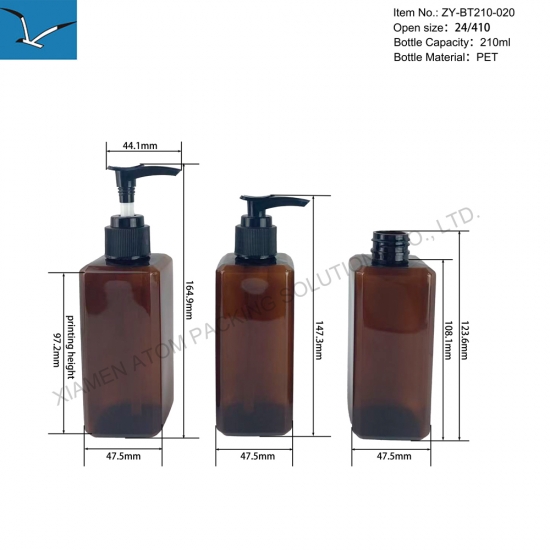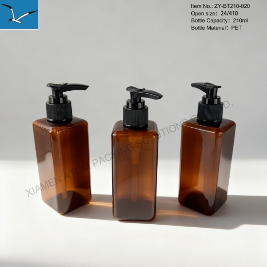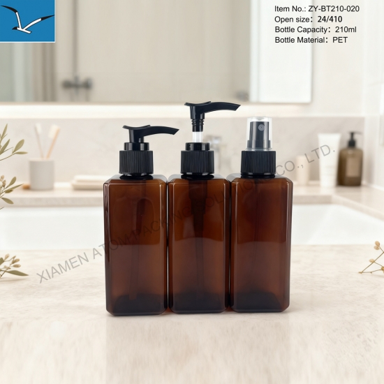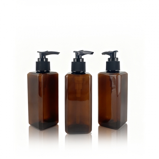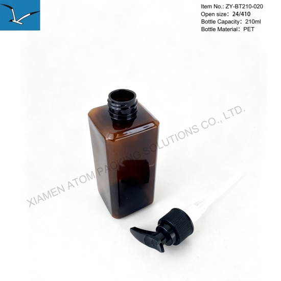 Custom Square 200ml 210ml PET Plastic Bottle Amber Cosmetic Shampoo Lotion Pump Sprayer Screen Printed